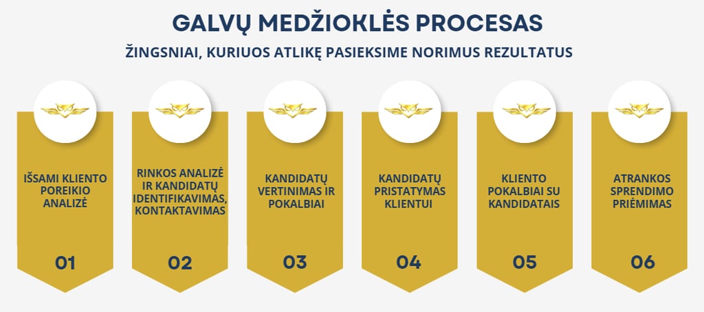 Galvų medžioklė - tai tiesioginė kandidatų paieška, kurie dirba ir darbo šiuo metu neieško. Galvų medžioklė leidžia pasiekti tuos kandidatus, kurių per skelbimus nepasieksite – ir būtent tarp jų dažniausiai yra stipriausi pasirinkimai.